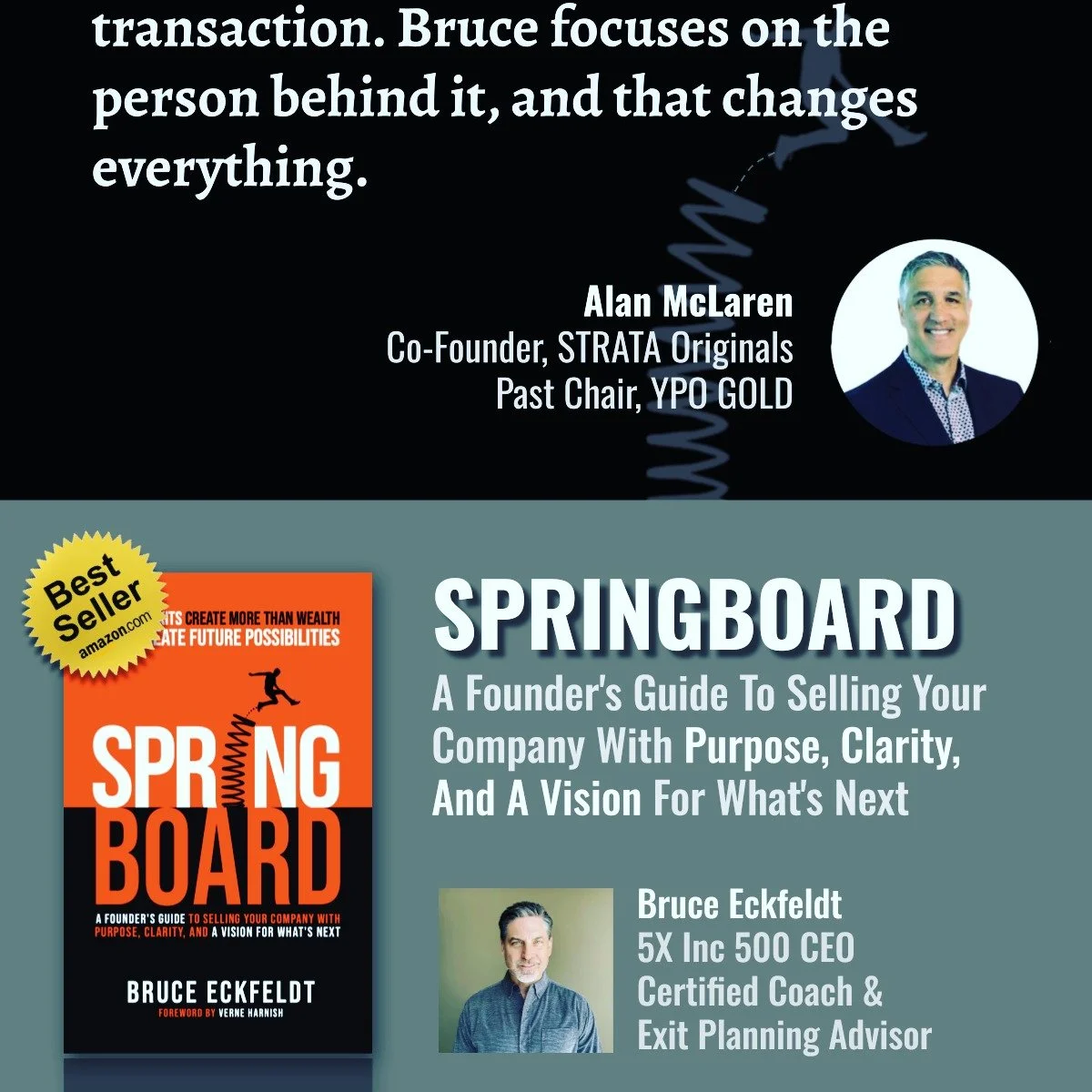 I'm Bruce Eckfeldt, a strategic business coach and exit planning advisor who helps founder-CEOs of $5M–$50M companies scale systematically and exit successfully. I built my own company to the Inc. 500 list for five consecutive years before exiting in 2013. Since then, I've guided dozens of founders through growth plateaus, leadership alignment, and exit preparation. I bring practical frameworks and intensive facilitation—but mostly I bring the experience of having built, scaled, and sold a company myself.